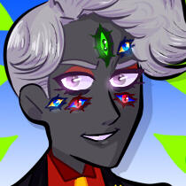 in person: a man standing as 5′7′’, he keeps two of his eyes as grayish purple, color of others is changable …and yes they glow and “multiply”. His skin is gray, cold to the touch, tend to get glitchy. His hair is pale (leaning towards white) gray. He wears fancy office clothes, which are a red shirt x yellow tie x black jacket x black trousers x heels